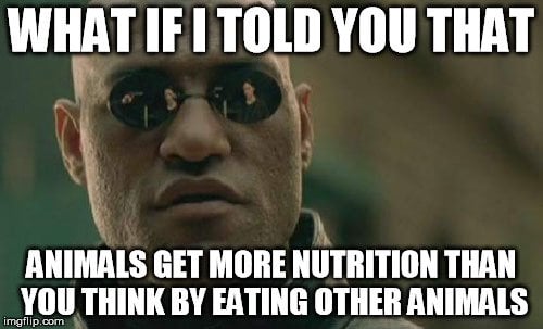 Second, carnivorous animals do eat the internal organs of their prey, which are often rich in certain nutrients that are impossible to find in their muscle tissue (or ‘meat’, as we call it). Thus, these animals manage to get a decent intake of key nutrients by way of eating the innards of their prey.