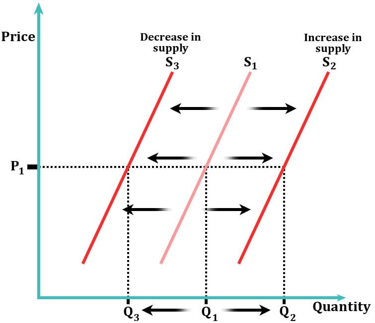 Supply curves also tend to shift when prices experience any changes. When the curve shifts to the left, it indicates that a smaller quantity of the good is sold at the same price — its supply has decreased. On the other hand, when the curve shifts to the right, more of the good is sold at the same price — its supply has increased.
