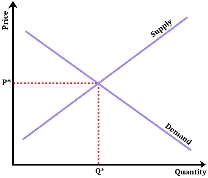 The market’s function is to find a point of intersection for the two slopes, known as an equilibrium price. Since it balances both the forces, at this point, the quantity demanded is equal to the quantity supplied.