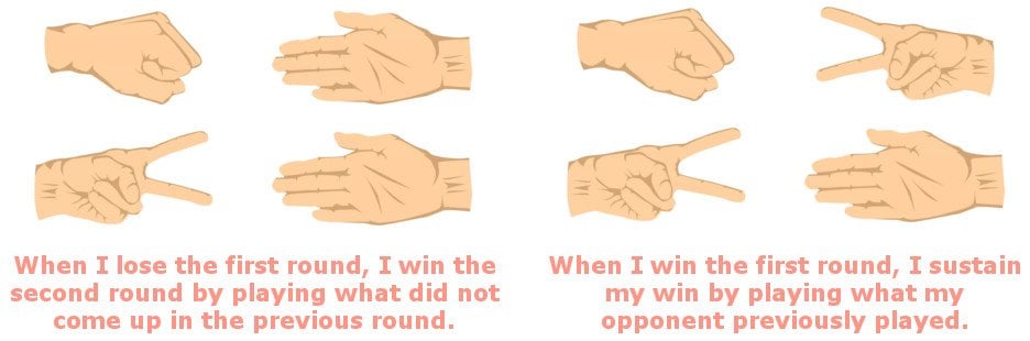 - If you lost the previous game, say, you played rock and your opponent played paper, he is highly likely to stay with his strategy and play paper again. Knowing this, you must play scissor, or to generalize – when you lose, play what did not previously come up.