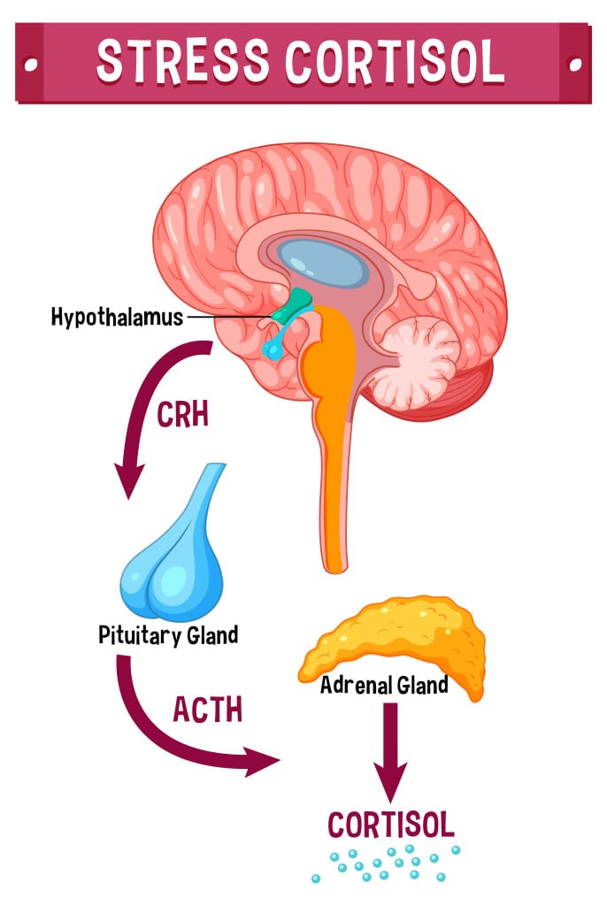 When you experience stress, the hypothalamus in the brain releases Corticotrophin Releasing Hormone (CRH). The CRH acts on the pituitary gland to release Adrenocorticotrophic hormone (ACTH). This finally stimulates the adrenal glands to release cortisol. (Credits: brgfx/Freepik)