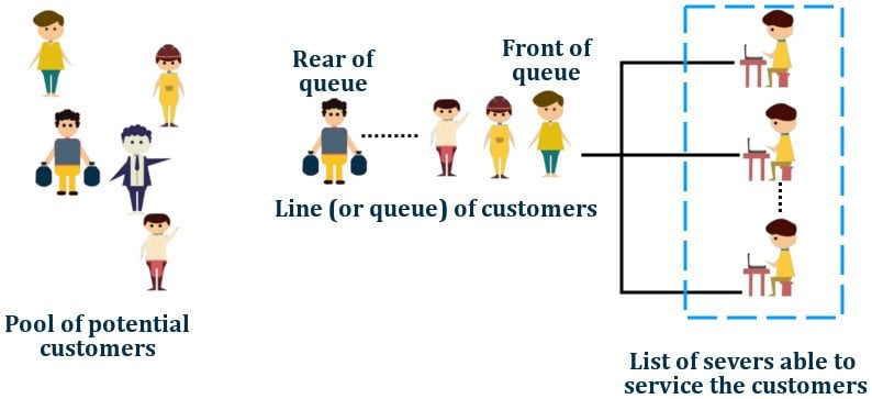 The ‘wait’ depends on the people served before you, the number of servers or counters in operation, and the amount of time required to serve each individual customer. The design of lines is also a huge factor. Whether there are parallel lines leading to different counters or a single line dividing into multiple counters can provide an approximate indication of the pace at which the line will move. Or, it could function on a first come-first serve basis or priority basis, such as in hospitals. All of these variables must be considered.
