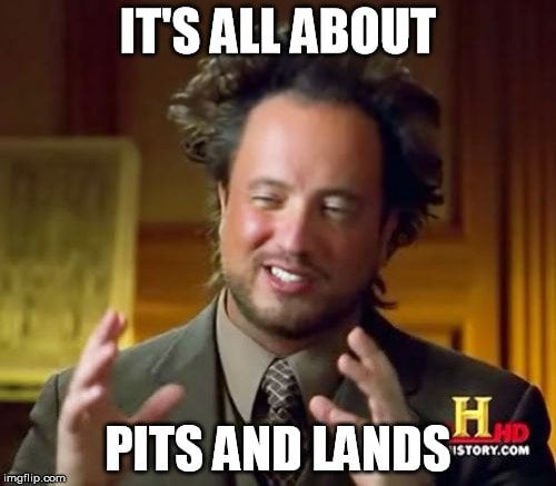 Data on a CD is encoded with the help of a laser beam that etches tiny indentations (or bumps, if you will) on its surface. A bump, in CD terminology, is known as a pit and represents the number 0. Similarly, the lack of a bump (known as land) represents the number 1.