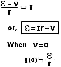 Here V is the voltage drop across the load R. Also, the maximum current that can be drawn from a battery is now reduced due to this internal resistance.