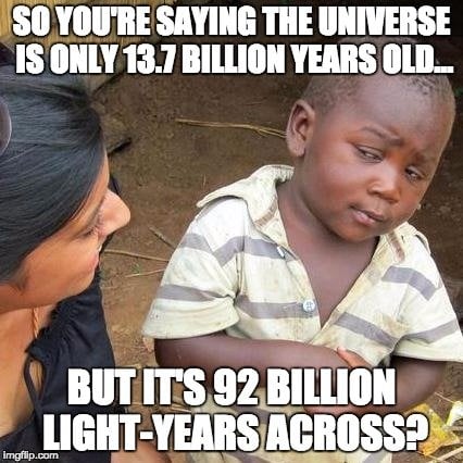 That final question (at least out of those three) is something that we can answer, although the explanation isn’t the easiest thing in the world to understand. Without getting into too many tangential or peripheral topics in astrophysics, let’s try, as simply as possible, to answer that question: how do scientists know how big the universe is?