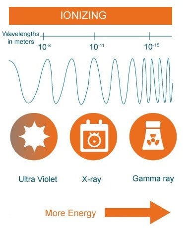 Ionizing radiation is radiation that has enough energy to remove electrons from atoms, thereby ionizing them. X-rays and gamma rays, and the lowest wavelength UV rays as well, are so energetic that their interactions with matter provide the impression that they behave as particles, rather than waves. Because their wavelengths are infinitesimally small, they cannot effectively interact with molecules on the skin’s surface and instead interact with entities of a comparable size.