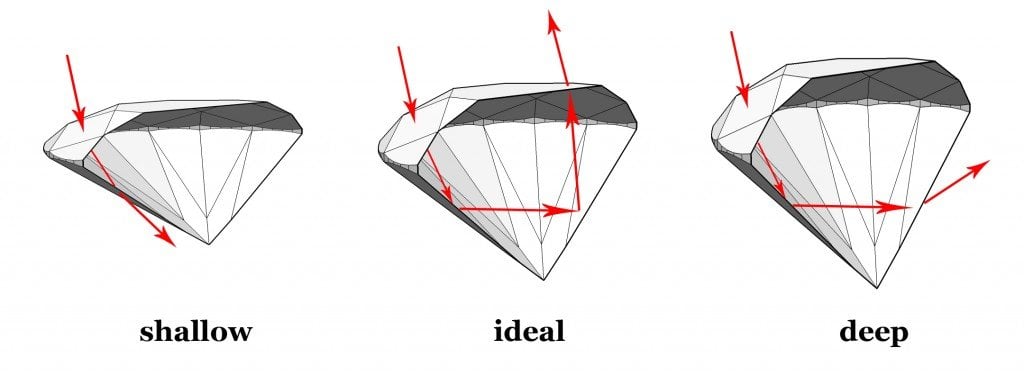 If a diamond is cut too shallow, then light will exit from the bottom, but if it is cut too deep, the light will exit from the side. While reflection is occurring, only a small portion of the light hitting the diamond is reflected; the rest passes through it.