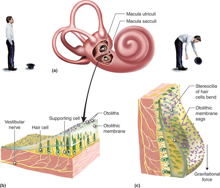 The images show how the utricle works. Notice the otoliths in images (b) and (c). (Credits: Cenveo)